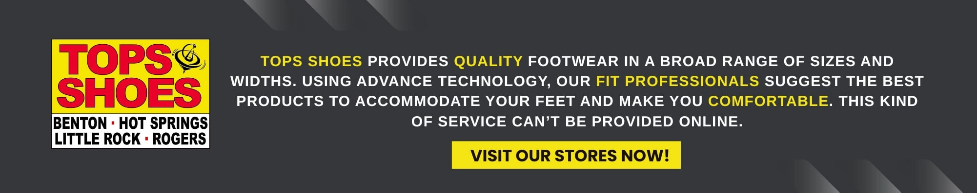 Visit our Tops Shoes locations in Benton, Little Rock, Hot Springs, and Rogers, Arkansas to find the perfect fit.
